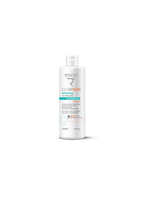 EAU MICELLAIRE ÉCLAIRCISSANTE – RONCEY CLAIRSKIN – 250ML l’eau micellaire Clairskin nettoyante et démaquillante est développé pour nettoyer la peau et traiter les taches de n’importe quel type de peau. avec une formule d’acide ascorbique, d’alpha-arbutine et d’acide hyaluronique, agit pour éliminer le maquillage et la saleté incrustée dans la peau, aide à éclaircir le visage et maintient son hydratation, est douce pour la peau, ce qui signifie qu’elle vous donne un effet instantané. fraîcheur et éclat. INDICATION : Cette eau micellaire est spécialement formulé pour les peaux souffraunt de troubles de la pigmentation et pour éclairer et unifier le teint